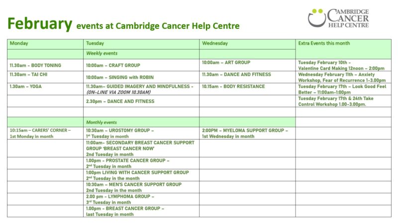 See below for our February 2026 programme of support groups, fitness, activities and events. Contact the Centre on 01223 840105 for more details (Monday to Wednesday).
