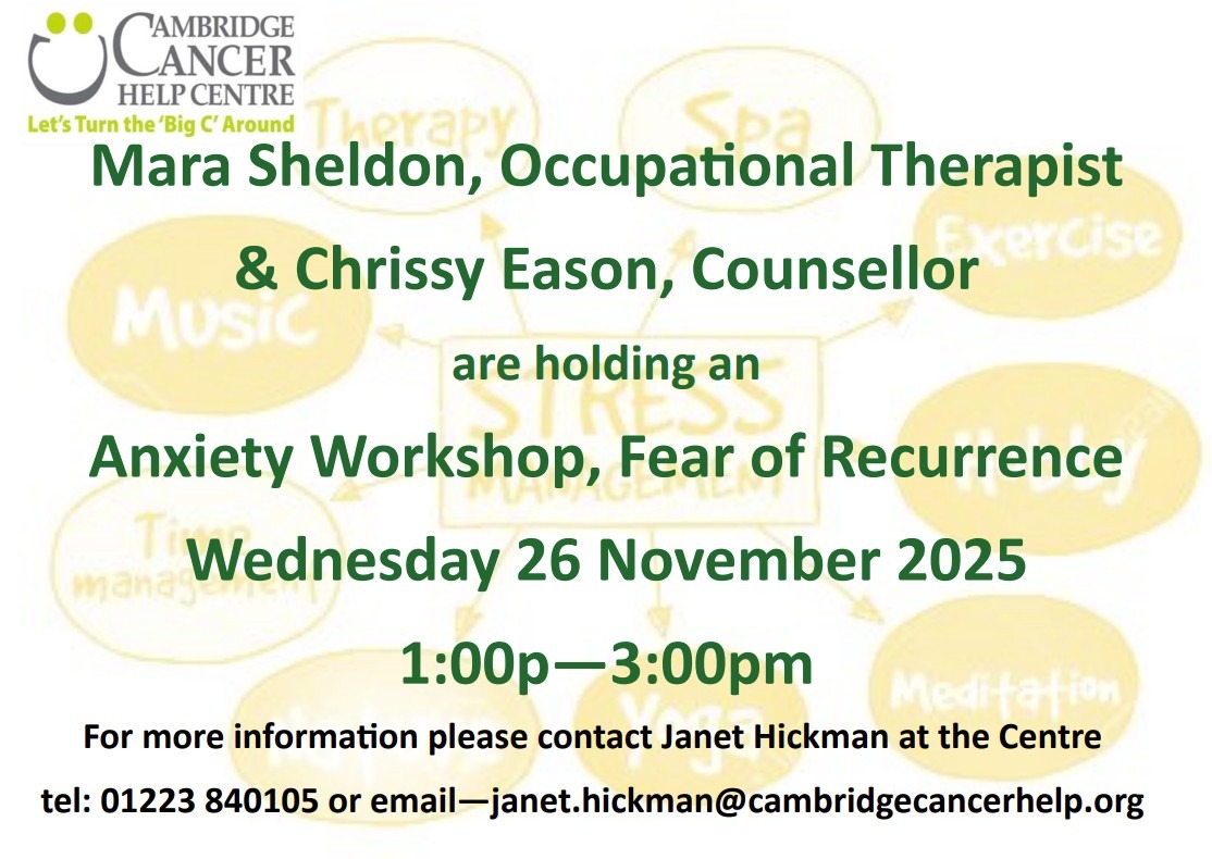 Anxiety Workshop – Fear of Recurrence on Wednesday 26th November 2025 from 1-3pm